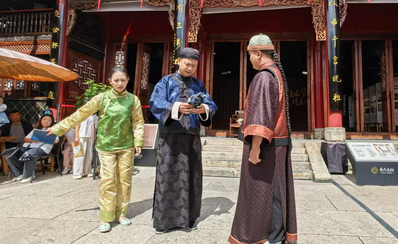 这场巡游以“王家商帮突破挑战与李家大掌柜完成关键交易”为故事主线,沿着云兴街、辕门口广场、陡街等历史街巷行进,最终抵达李氏支祠,全程覆盖昭通古城核心区域。
