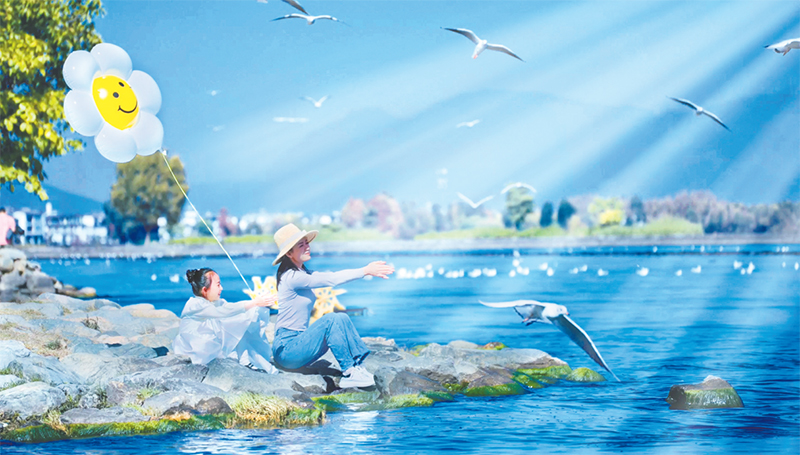 近年来,云南省加强洱海全流域生态保护治理,建成129公里生态廊道,提供了“水清、岸绿、景美”的亲水空间。图为2024年11月8日,游客在洱海边与海鸥亲密互动。 大理州洱海管理局供图