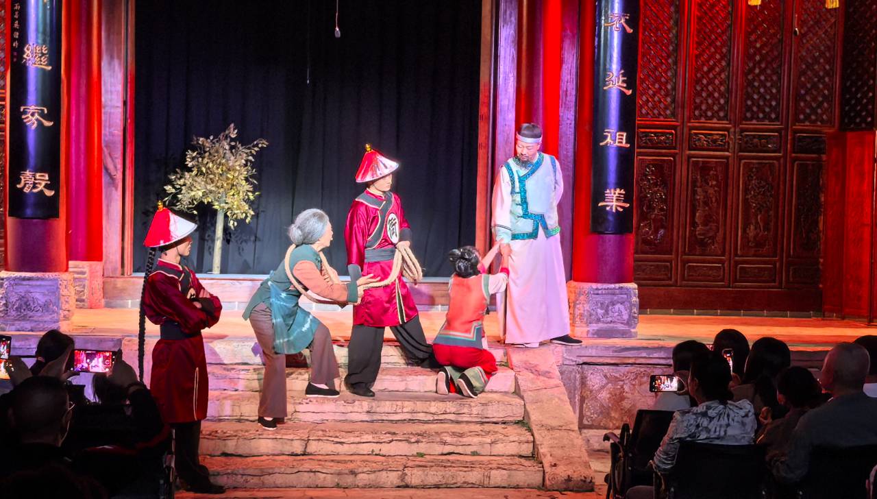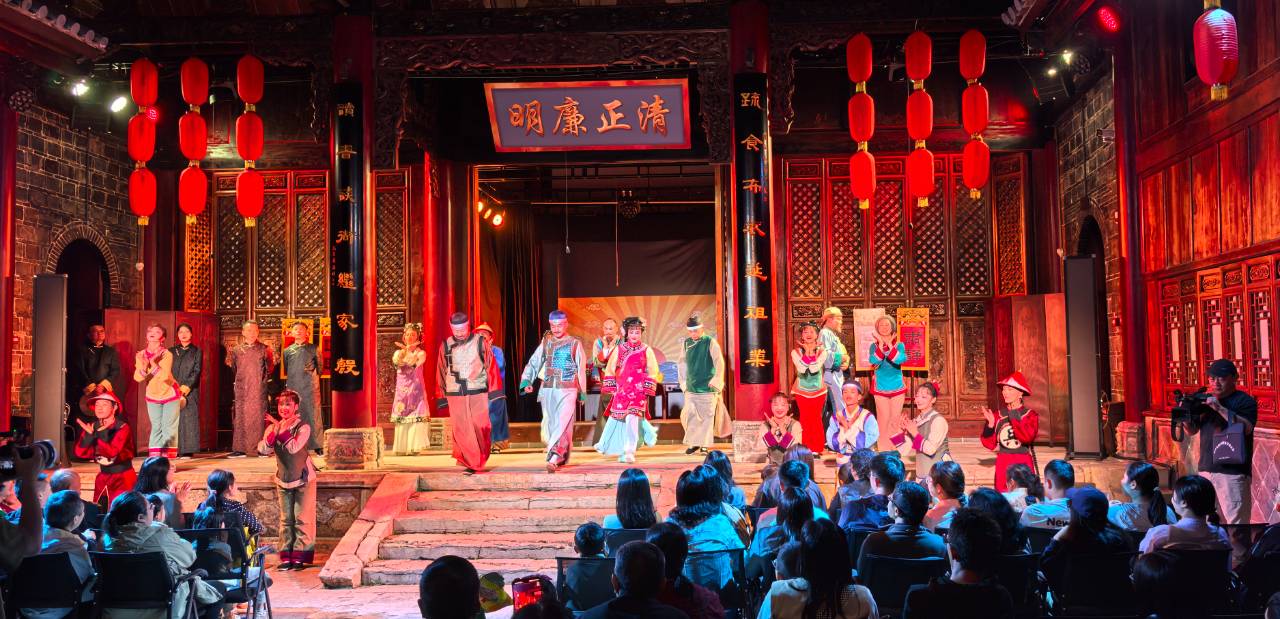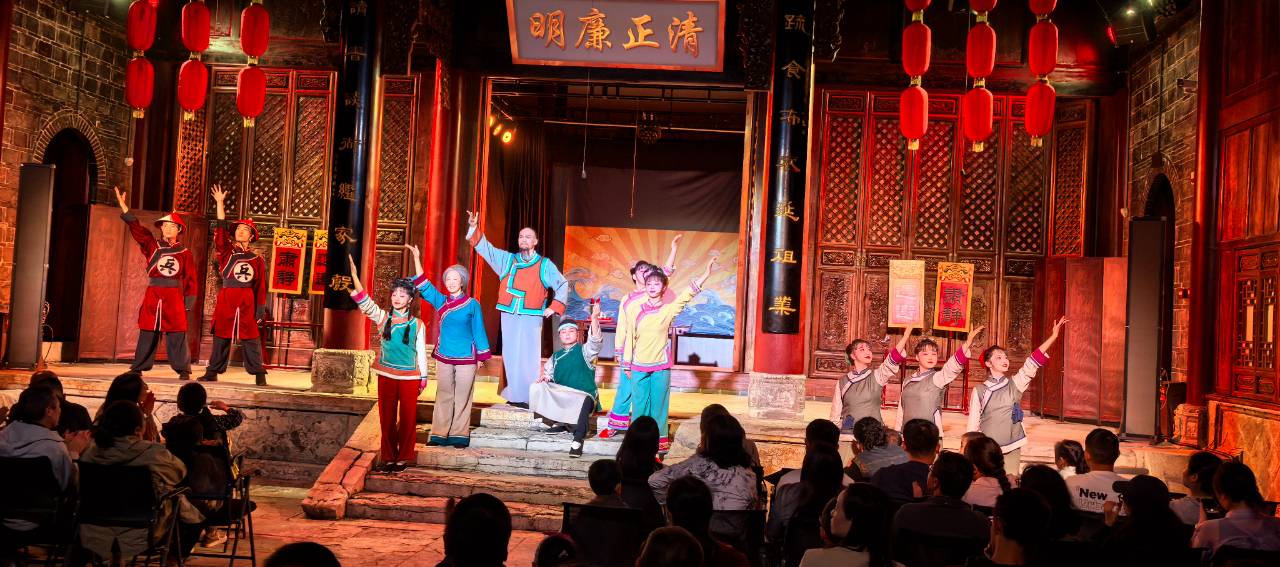 曲终人未散,这份不舍里,藏着对文化的珍视,更藏着对团圆的眷恋。据《柯四先生》的导演兼县令龙必统扮演者袁磊介绍,10月1日晚的演出已是该剧第8场公演,选择在双节期间上演,既是对老一辈艺术家的缅怀,也是想借柯四先生的故事,传递“家有温度、国有风骨”的团圆内涵。袁磊说:“这部剧的前身是20世纪80年代老一辈艺术家创作的作品。时隔37年,我们通过走访老艺人、整理民间故事,将它改编成庭院剧。双节期间演出,就是想让年轻人知道,咱昭通的团圆记忆里,不仅有月饼和月亮,还有这些值得代代相传的本土故事。看着台下老老少少坐在一起笑、一起感动,就知道这份文化的团圆,接上了!”
