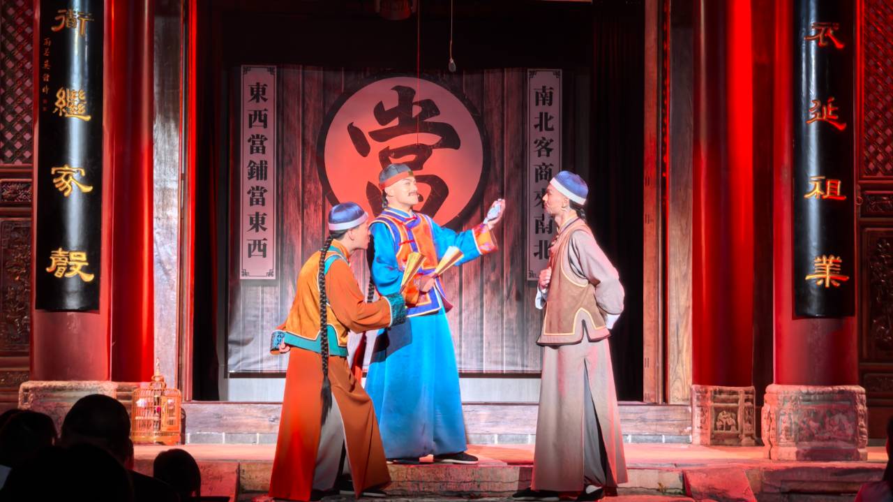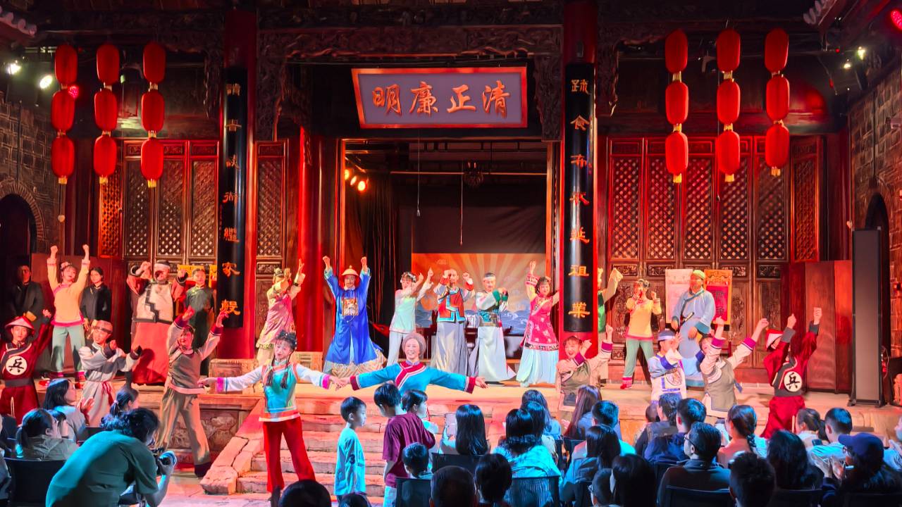 “我在这儿等着你回来~”演出尾声,《桃花朵朵开》的熟悉旋律响起,所有演员齐聚舞台中央,伴着明快节奏翩翩起舞。台下观众不自觉地跟着节拍轻晃,手中的手机闪光灯如点点星光,与庭院上方的明月交相辉映。有人跟着哼唱,有人举起相机记录,直到演员们深深鞠躬,仍迟迟不愿离去——“就像家里的聚会还没散场,意犹未尽!”观众李女士笑着说,她已约好家人,节后还要再来二刷。