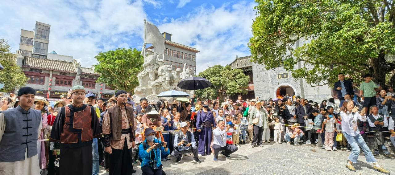 10月1日下午1点,抚镇门广场迎来当日活动高潮。身着清末民初服饰的“王家商帮”列队而出,“大掌柜”手持马鞭走在前方,数十名“伙计”牵着挂货囊的马匹、推着独轮车紧随其后,清脆的驼铃声穿透人群。巡游队伍沿云兴街行至箭道广场时,“士兵”们手持长矛操练的呐喊声引得游客纷纷驻足,挑水巷里“卖糖人”“卖包子”的吆喝声更让市井气息扑面而来。