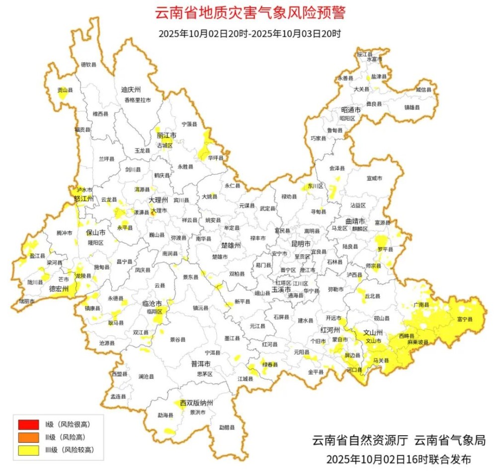 10月2日20:00至10月3日20:00,昆明市东川区、禄劝县,文山州富宁县、麻栗坡县、马关县,大理州大理市、漾濞县发生滑坡泥石流的风险高;昆明市北部,昭通市北部,曲靖市北部、东部至南部,玉溪市西南部,保山市北部至南部,楚雄州北部和西部,红河州东部至南部,文山州大部,大理州北部至中部、西部,德宏州东部和中部、西北部,丽江市中部和东部,怒江州北部、南部,临沧市东部至东南部、西南部发生滑坡泥石流的风险较高。