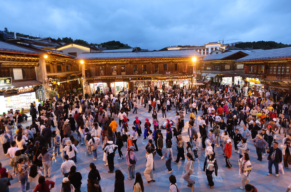 月光广场中央每日上演藏族弦子舞、纳西族白沙细乐等跨民族文艺表演,吸引各族群众共舞共乐,让千年民族团结故事“活”在当下。