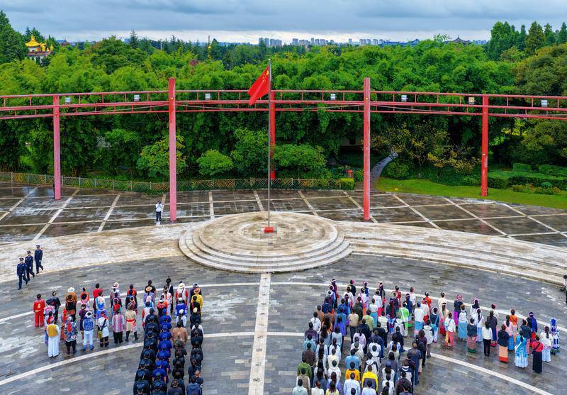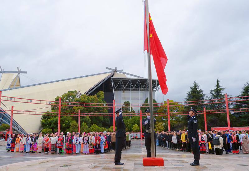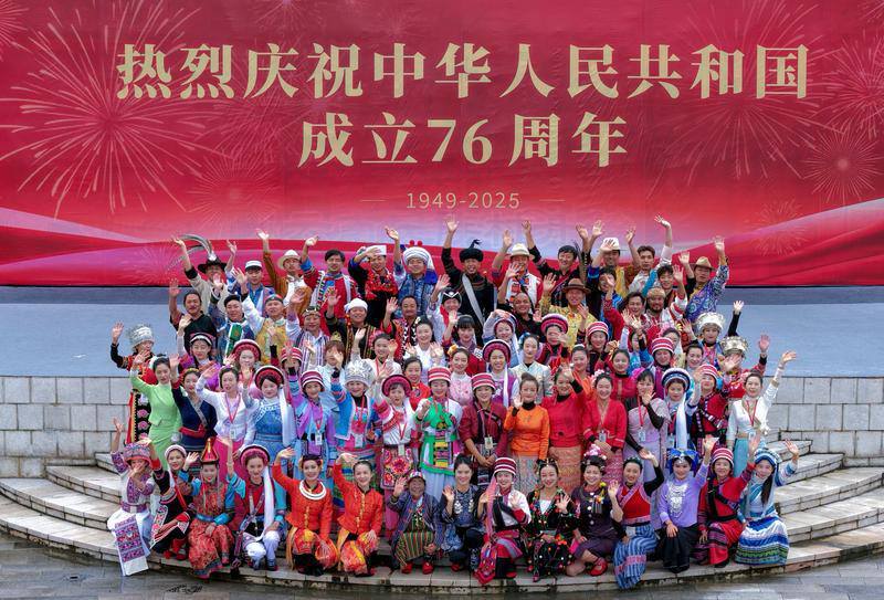 2025-10-03 13:29“中华民族一家亲,同心共筑中国梦,祖国万岁。”10月1日晨曦初露,在云南民族村团结广场,26个民族的盛装与五星红旗交织成最绚丽的色彩。
