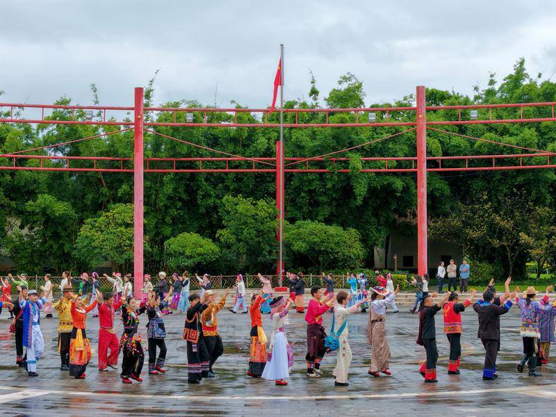 升旗仪式后,云南民族村团结广场上响起阵阵清脆的民族歌声,来自云南26个民族的兄弟姐妹与广大游客一起载歌载舞,各族儿女用歌声传递祝福,用舞蹈表达喜悦,共同庆祝祖国的生日。