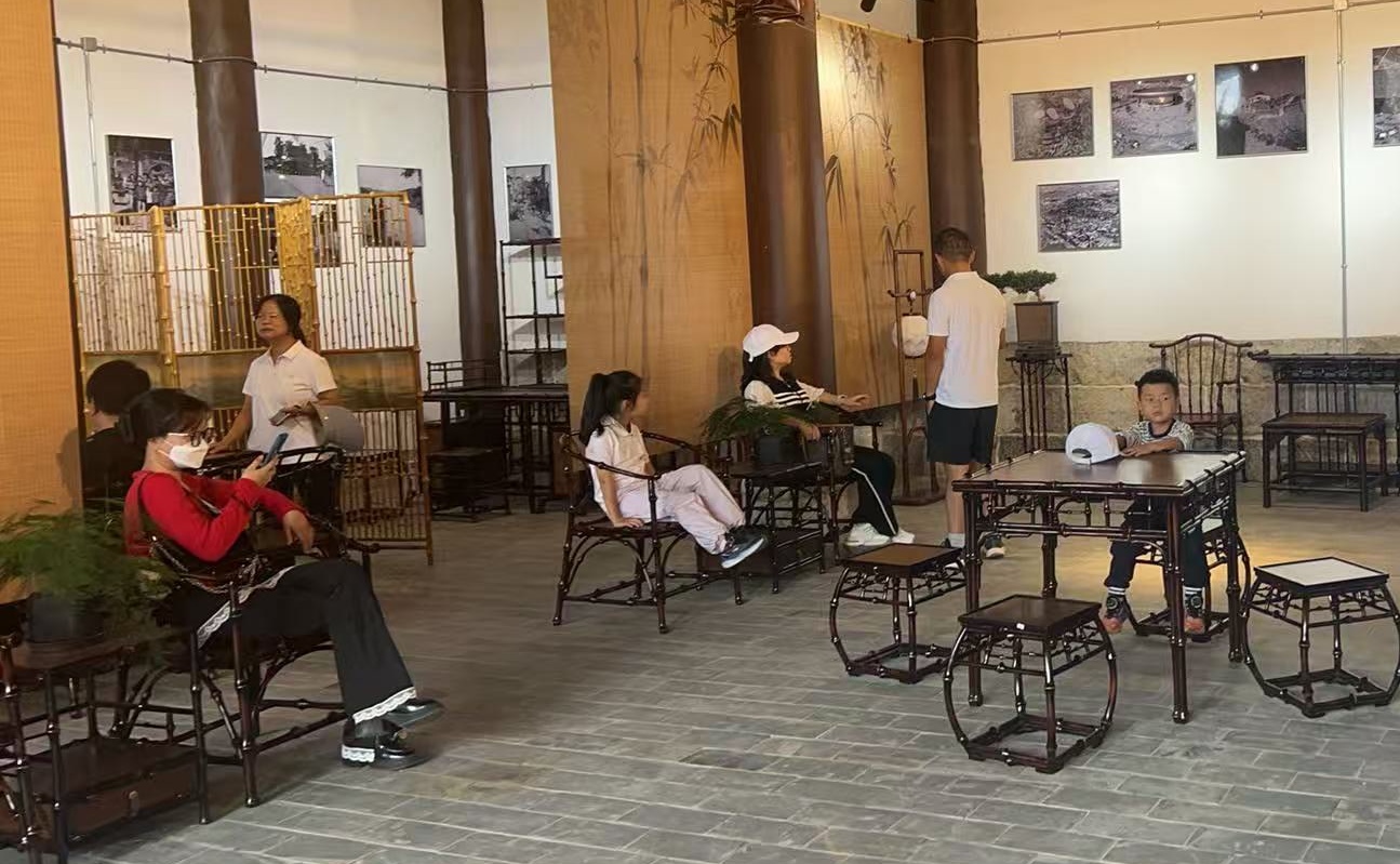 10月3日,记者走进展馆时,游客络绎不绝:有人驻足细细欣赏,有人亲手触摸体验,有人举起手机拍照打卡,对眼前这些竹制家具与工艺品表现出浓厚兴趣。来自湖北恩施的游客田秋婷体验后连连称奇:“太神奇了!一根竹子居然能做成桌子、凳子、屏风,特别有艺术感。而且这竹子很特别,我们那儿的竹子竹节没这么大,坐起来舒服,摸着手感也光滑。”