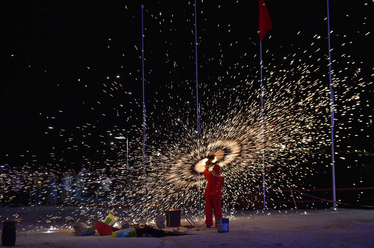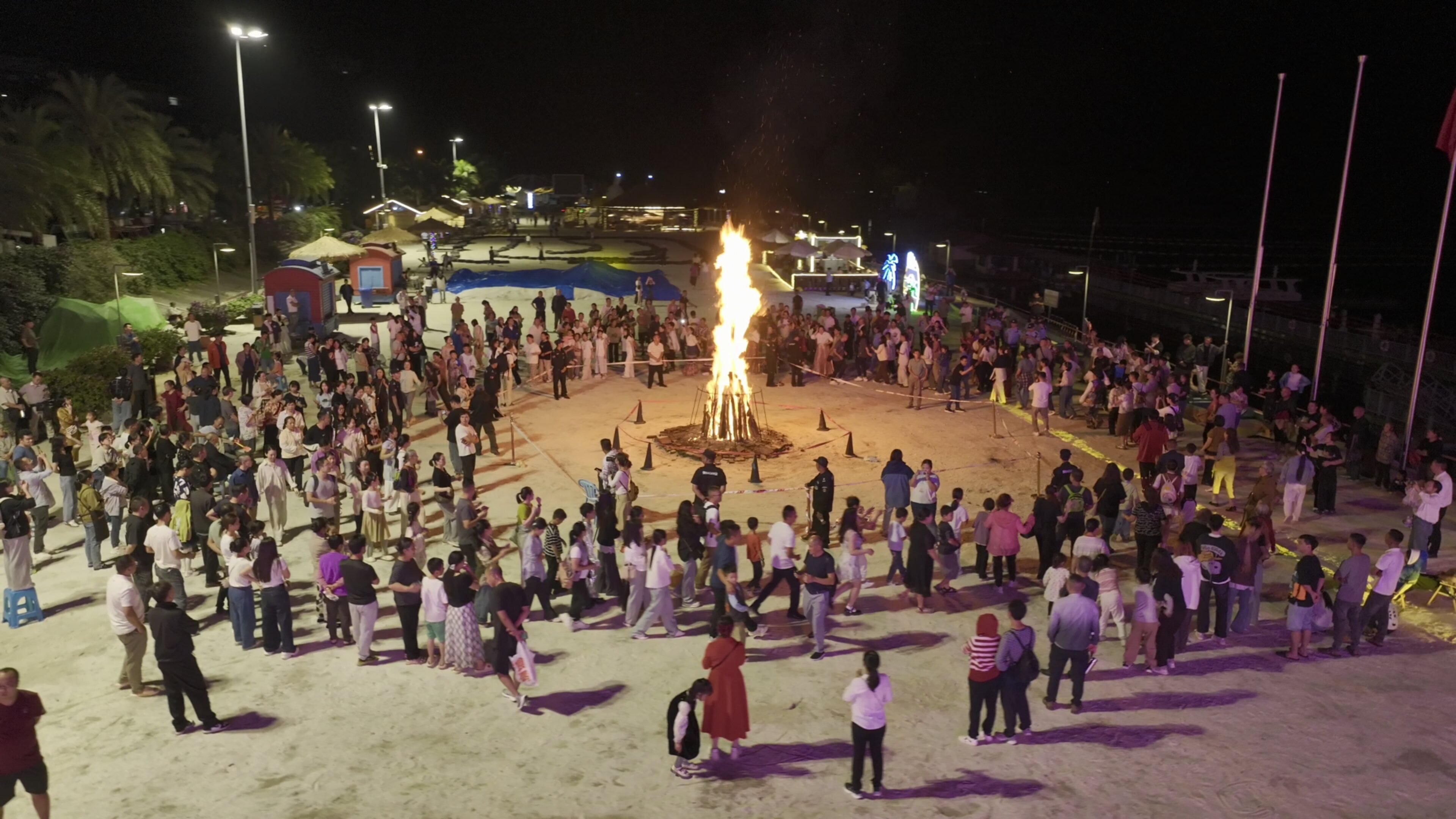 夜幕降临,沙滩音乐节以热情音浪点燃现场气氛,其中国家级非遗表演“打铁花”吸引众多游人驻足围观——炽热的铁水在空中泼洒成星火,璀璨夺目。游客还可以加入云南民族特色的打跳队伍中,围着熊熊篝火,与当地居民共舞,感受淳朴的热情。