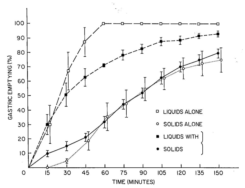 混合进餐时液体排空受固体轻度延迟影响,而固体排空不受液体影响。图源:科学辟谣