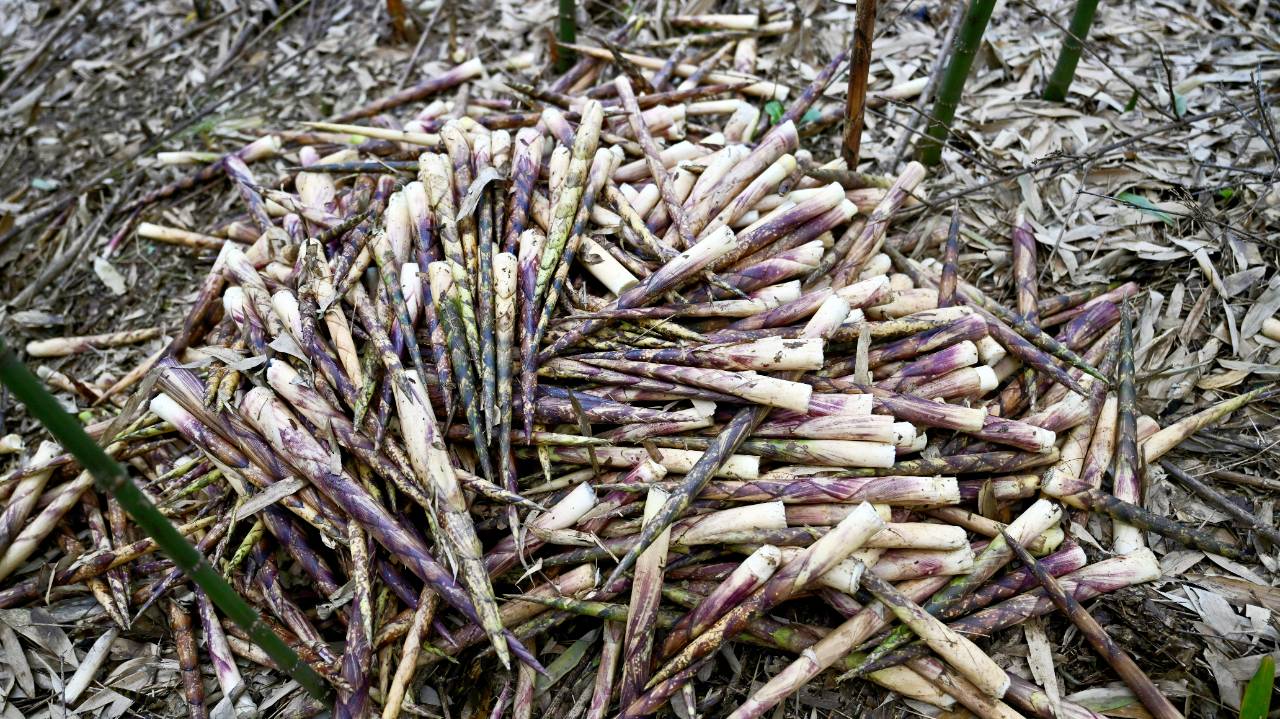 刚挖出来的竹笋被毛茸茸的外壳紧紧地包着,笋农们熟练地剥开外壳,露出黄绿相间的“嫩肉”,空气中弥漫着竹笋的清香。剥好的竹笋将在下午运送到村里的加工厂进行收购。