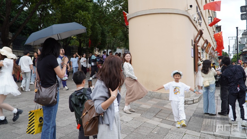 抗战胜利堂于1946年建成,这片历史文化街区如今已成为融合历史底蕴与现代活力的文旅消费聚集区。国庆期间,街区展现出强大的消费吸引力。“今年以来,特别是节假日,对月楼附近的游客明显增多,”一家旅拍店负责人指着店内悬挂的民族服饰告诉记者,“我们的传统服饰租赁和摄影服务需求旺盛,客人拍完照后还会顺带购买文创产品,节日营业额比平时翻了一番。”