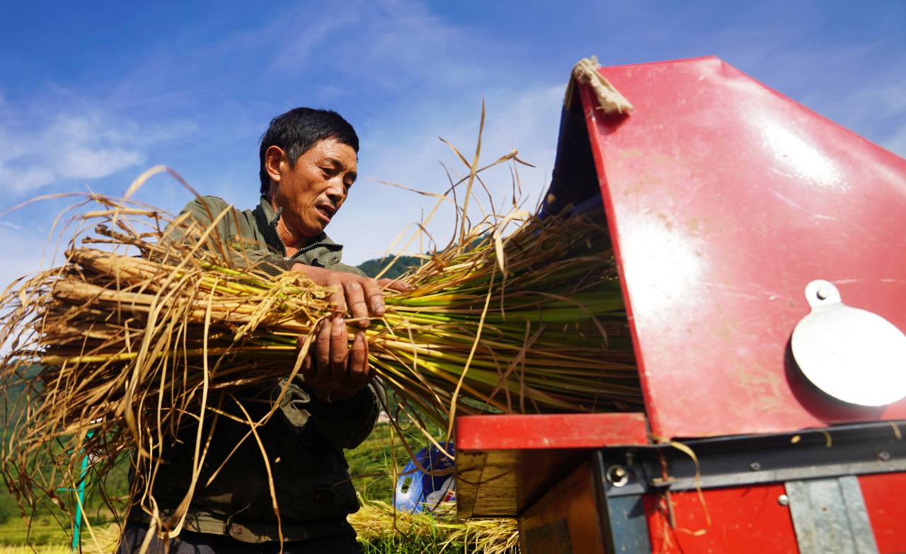 同一时间,在离县城不远的角奎街道马窑村,稻谷种植户刘明兵也开始了收割工作,村“两委”干部和驻村工作队员也加入其中,割稻、脱粒、装袋、运输……大家分工协作,干劲十足,尽管汗水浸湿衣背,但每个人的脸上却都洋溢着喜悦,这丰收的景象是彝良县狠抓粮食生产、促进农业增效的生动缩影。“我家今年种了3亩稻谷,一亩估计收1500斤左右,除了自己留来吃的,剩余的背去出售以后,估计还能收入一万两千元。”刘明兵乐呵呵地说道。