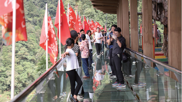 在景区“双瀑迎客”景点,来自四川乐山的代晓梅一家被扑面而来的水雾震撼:“真正体会到了‘飞流直下三千尺’的意境!”在“水帘长廊”景点,游客们在廊内穿梭,感受“岩嵌长廊晴也雨”的诗意。在“玻璃栈道”,游客们在体验惊险刺激之余,还能身临其境了解大关“红旗渠”——出水堰的修建历史。