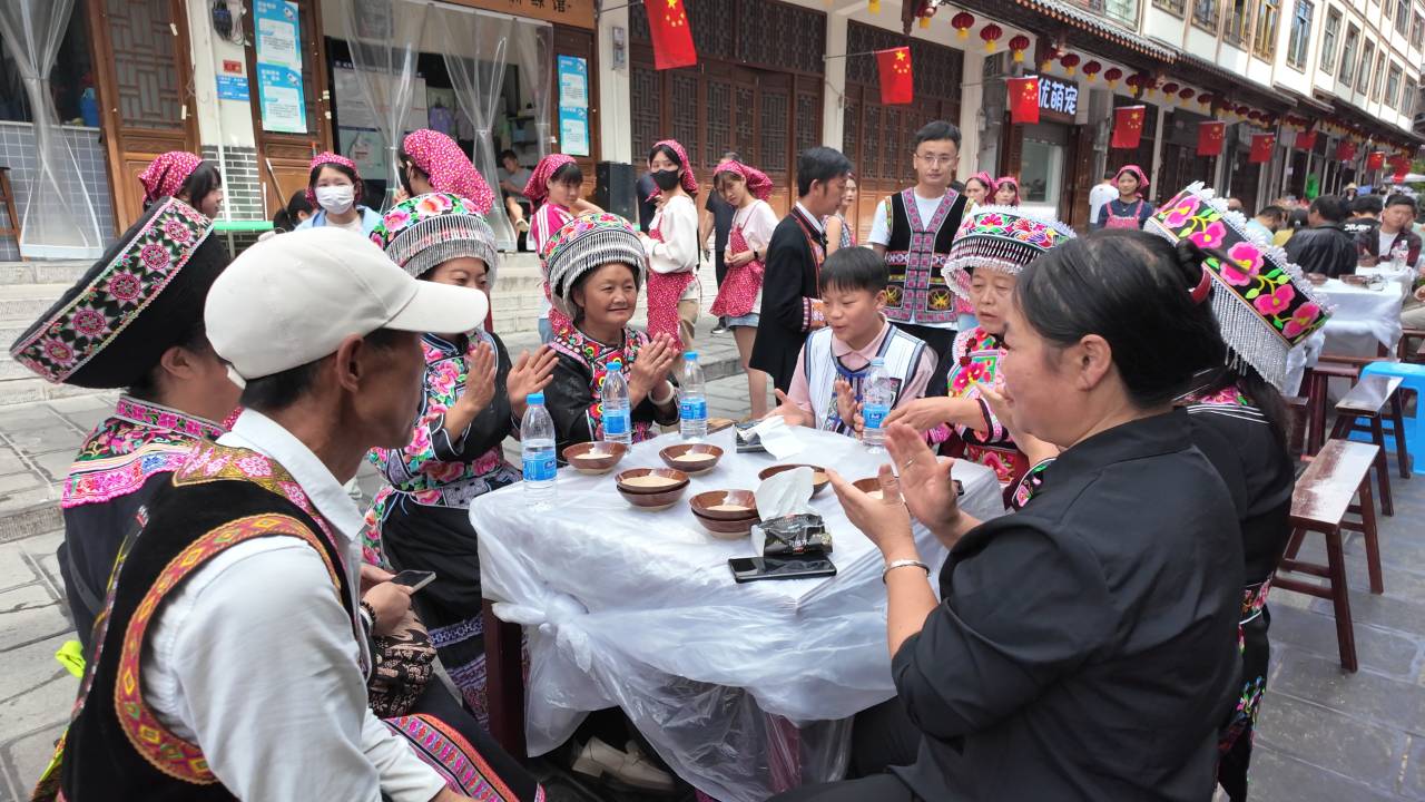 “唱支山歌给党听,我把党来比母亲……”本地苗族大娘杨廷玉起了个头,不同民族的歌声渐渐汇成同一旋律。汉语、苗语、彝语的歌词交织在一起,语言虽异,对祖国的热爱与对美好生活的向往却相通。掌声、欢笑声、喝彩声此起彼伏,整条街巷成了欢乐的海洋,民族团结的真情在歌声中流淌、升华。