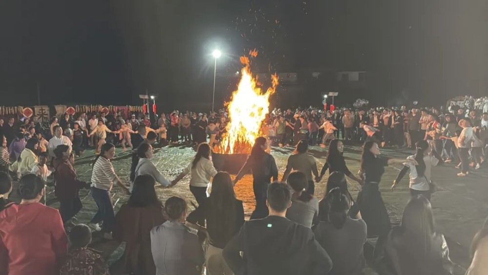 夜幕降临,篝火熊熊燃起。众人手拉手,围着火堆跳起“三跺脚”,歌声笑声交织,灯火与星光相映,绘出一幅充满活力的乡村振兴新画卷。