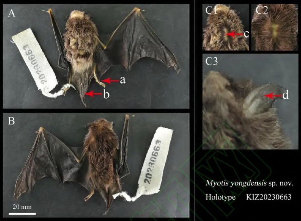 据了解,永德鼠耳蝠发现于云南永德大雪山国家级自然保护区。科研团队基于形态特征与分子系统学分析,确认其与已知鼠耳蝠物种存在显著差异,遗传距离达9.40%,已达到种级分化水平。