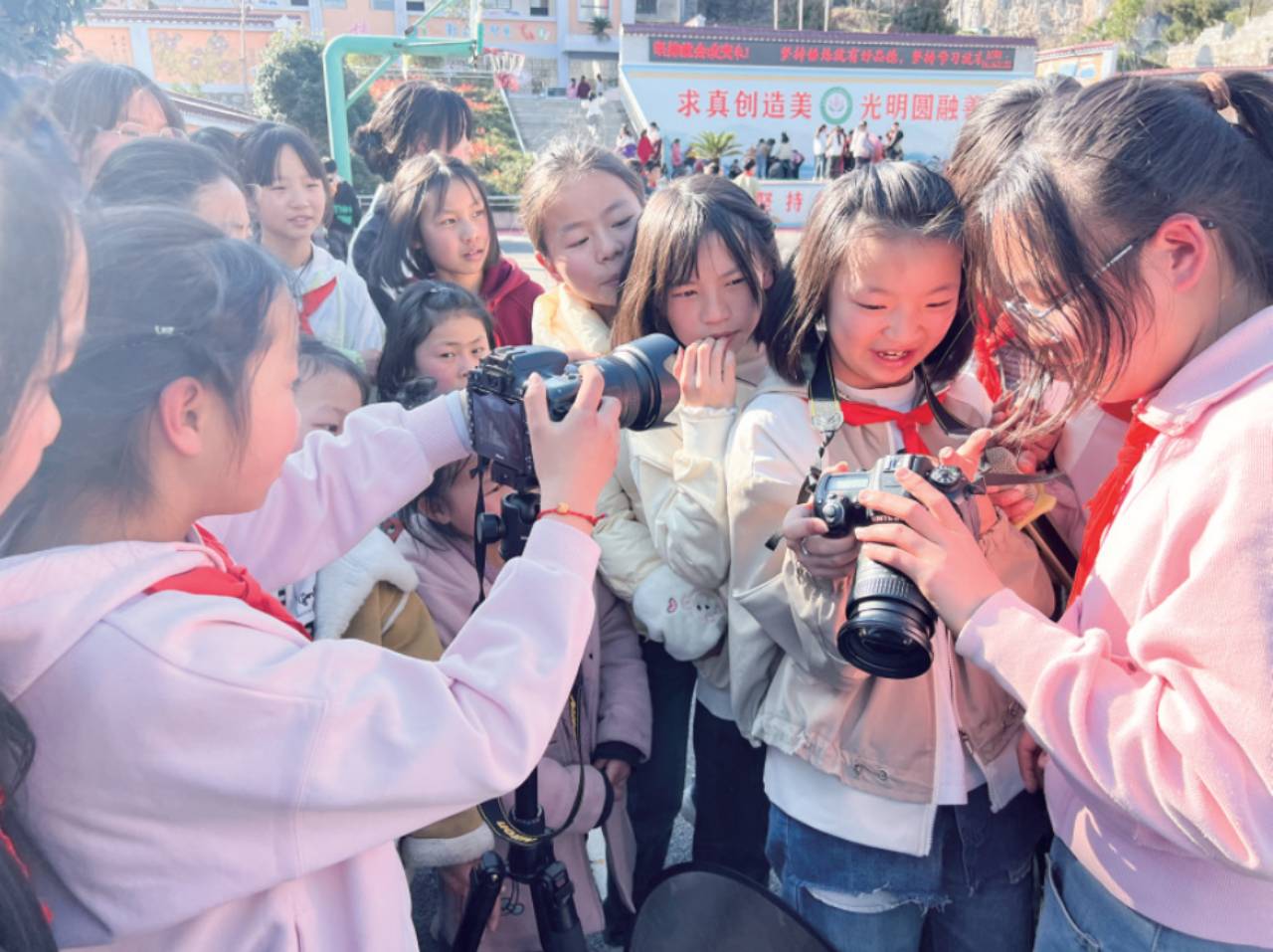 记者走进镇雄县陇家湾小学,带学生了解相机的操作。