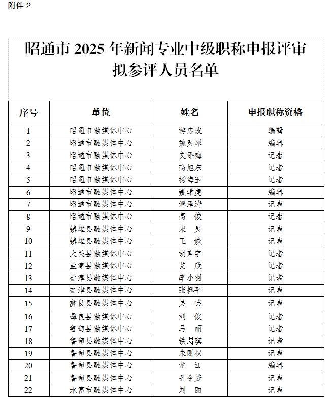 2.昭通市2025年新闻专业中级职称申报评审拟参评人员名单。