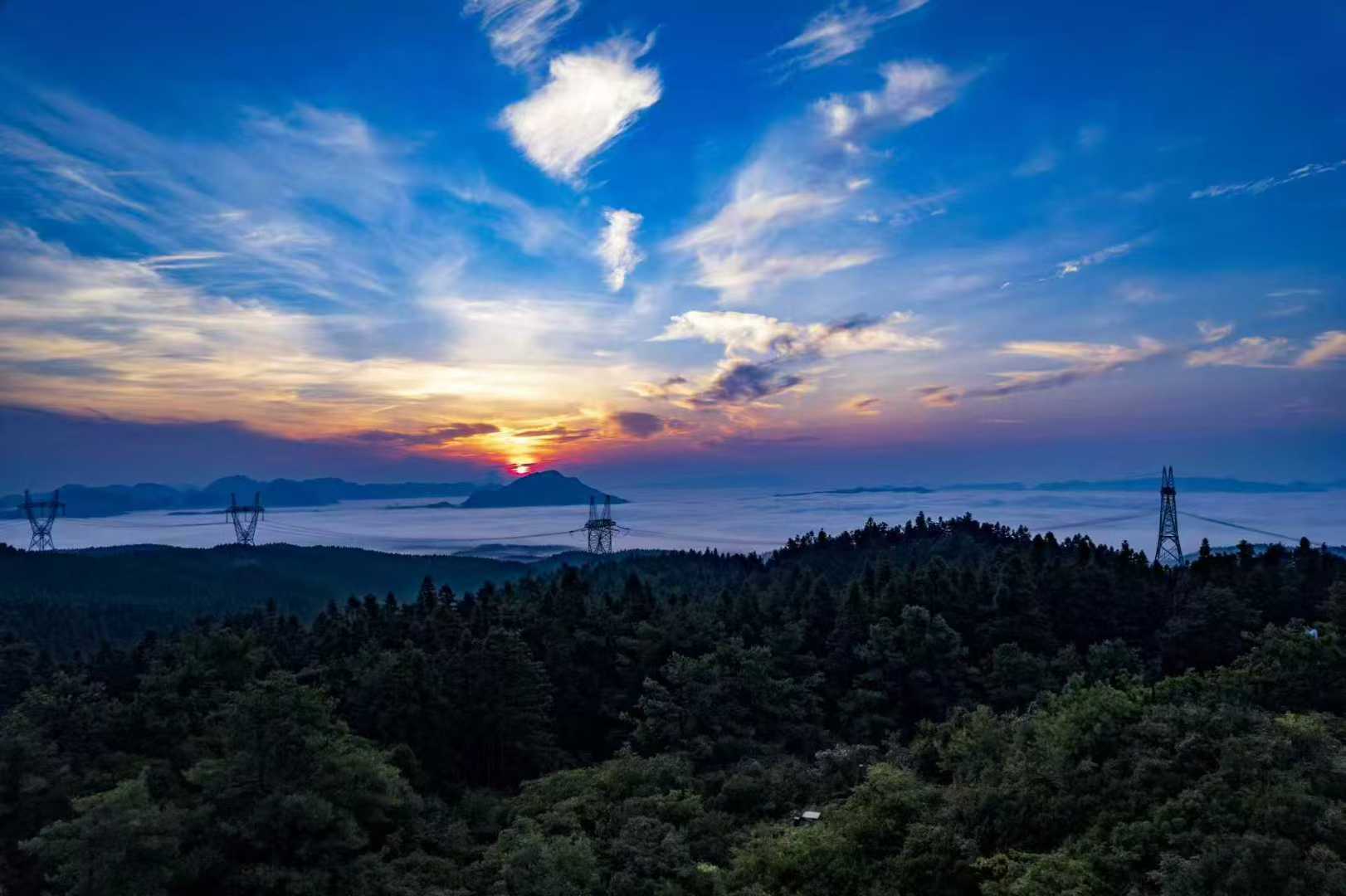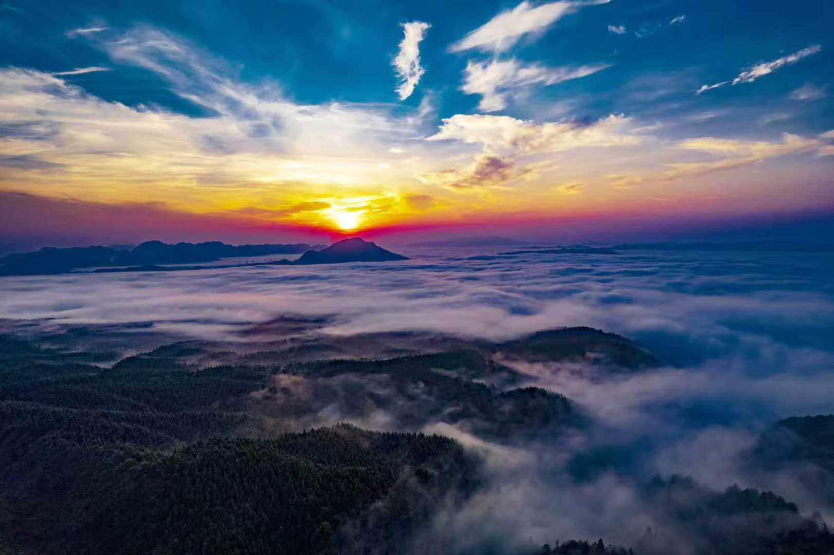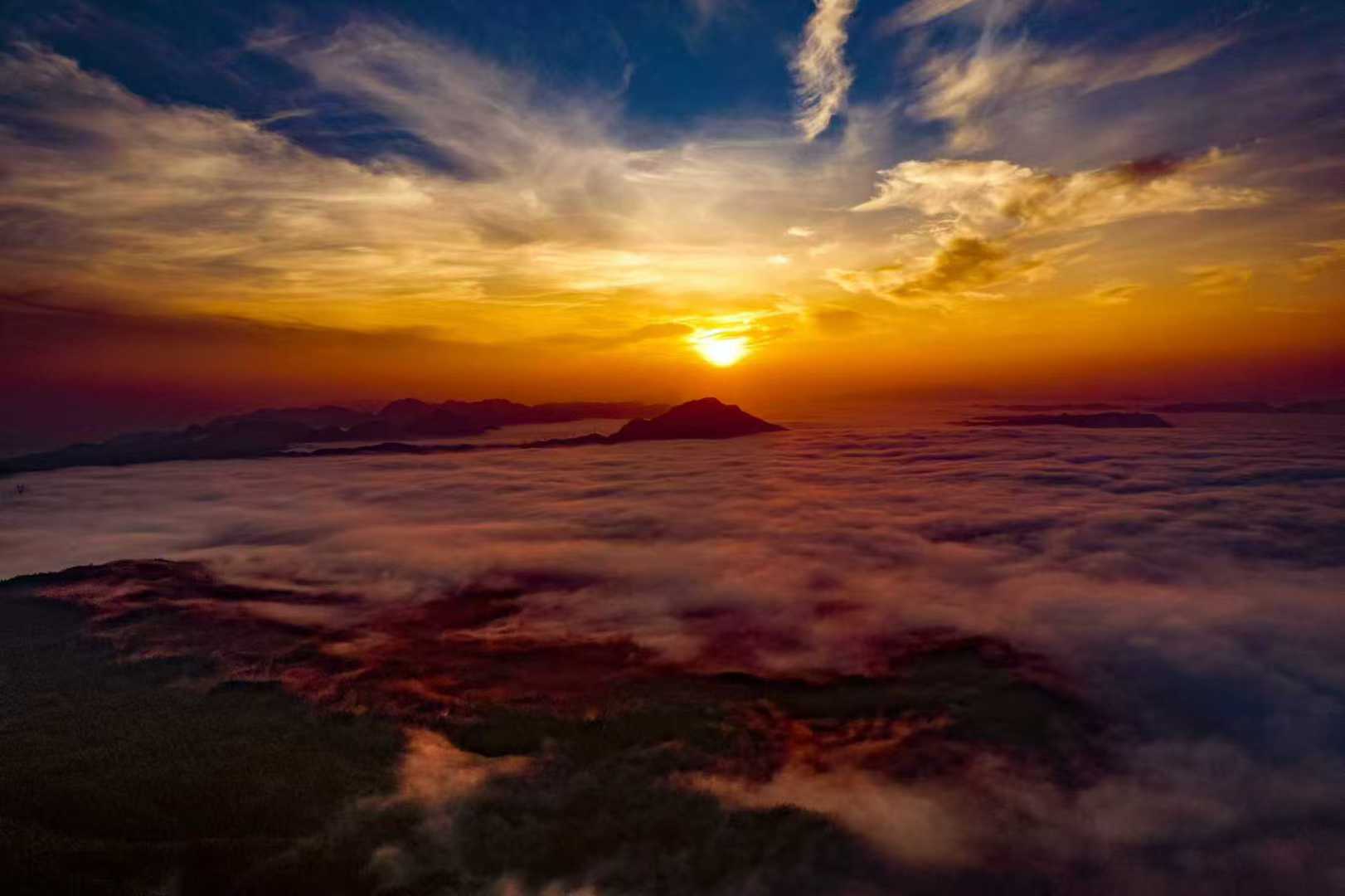秋天的高原,云海从山间升腾而起,托起了破晓的万丈霞光。