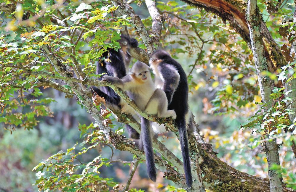 近年来,云南省持续推进滇金丝猴栖息地修复工作,通过种植云杉、冷杉等树种,在白马雪山国家级自然保护区等地成功构建起连接滇金丝猴栖息地的生态廊道,滇金丝猴种群数量持续增长。目前,保护区内的滇金丝猴种群数量已增长到约2800只,占全国的65%以上。图为滇金丝猴在位于维西傈僳族自治县塔城镇的香格里拉滇金丝猴国家公园内嬉戏玩耍。
