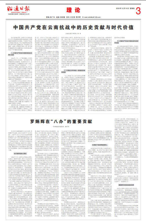 2025-10-16 09:08作为红军高级指挥员、抗日名将,罗炳辉声名远扬,在抗日战争中“立功尤著”。1937年12月,中共中央派罗炳辉前往武汉,以八路军副参谋长的公开身份参加“八办”工作,担任滇军统战工作组组长和招生委员会副主任,积极开展广泛的社会活动。本文重点介绍他在对滇军60军开展统战、恢复中共云南省工委和输送抗日干部等方面所作出的重要贡献,激励读者从中汲取精神力量,弘扬伟大抗战精神,为现代化昭通建设贡献力量。