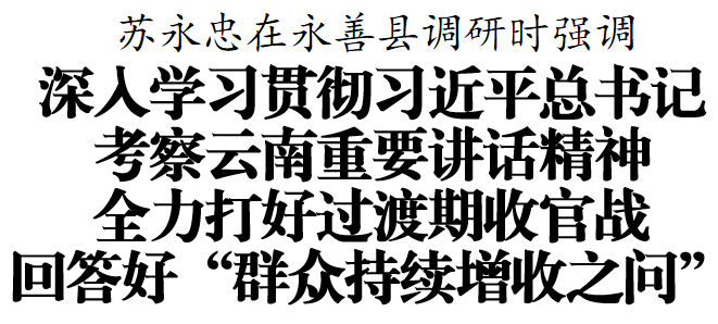 在茂林镇文山村,苏永忠详细了解脱贫成果巩固、产业发展等情况,对茂林镇因地制宜发展冷凉蔬菜和中药材产业,带动群众就近就地就业增收成效给予肯定,强调要大力调整产业结构,推动产业转型升级,让群众在产业发展过程中获得更多收益。在黄华镇朝阳社区,苏永忠实地调研永善县域副中心规划发展及商贸物流园区规划建设推进情况,要求充分发挥区位交通优势,着力打造黄华物流枢纽小镇,统筹推进城乡融合发展。在务基镇青龙社区,苏永忠听取了永善县及青龙社区农文旅融合发展情况,强调要立足资源禀赋,加强旅游产品创新和业态培育,系统规划旅游精品线路,着力打造湖滨生态旅游目的地。