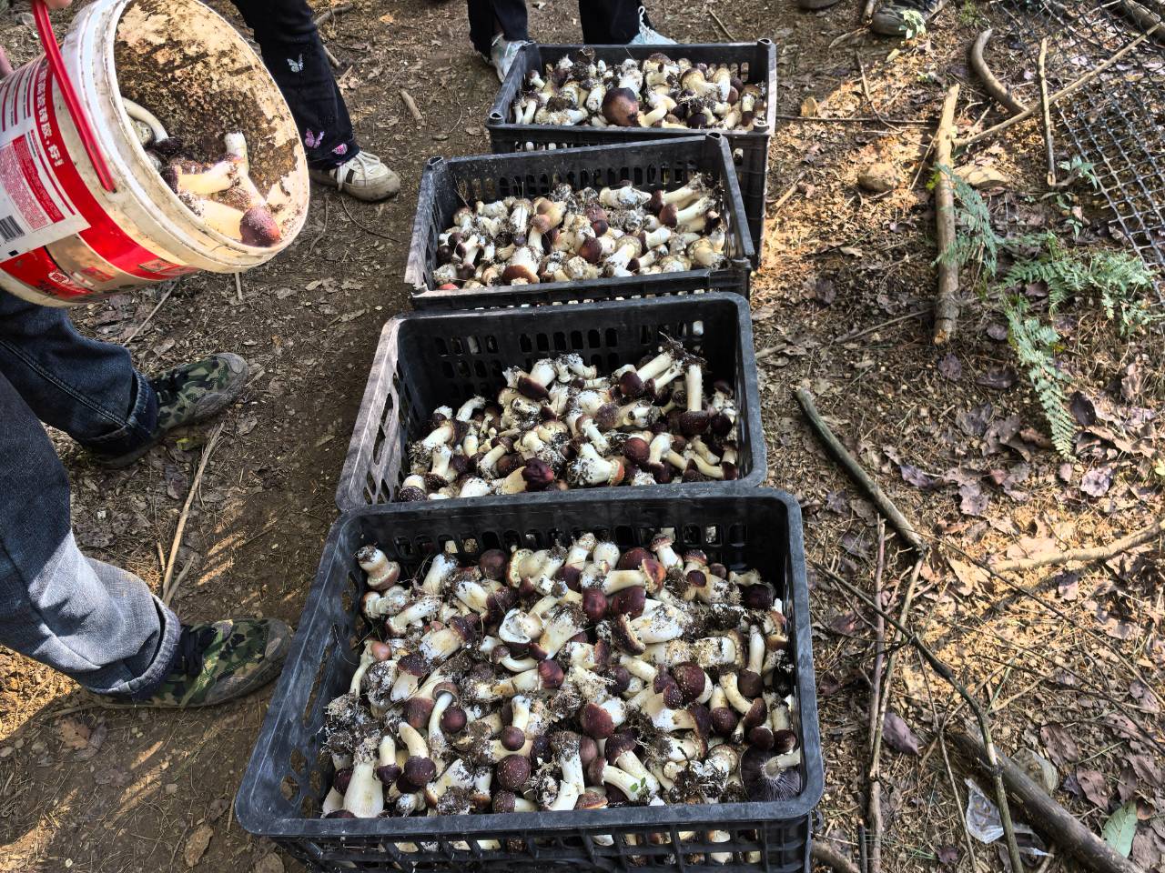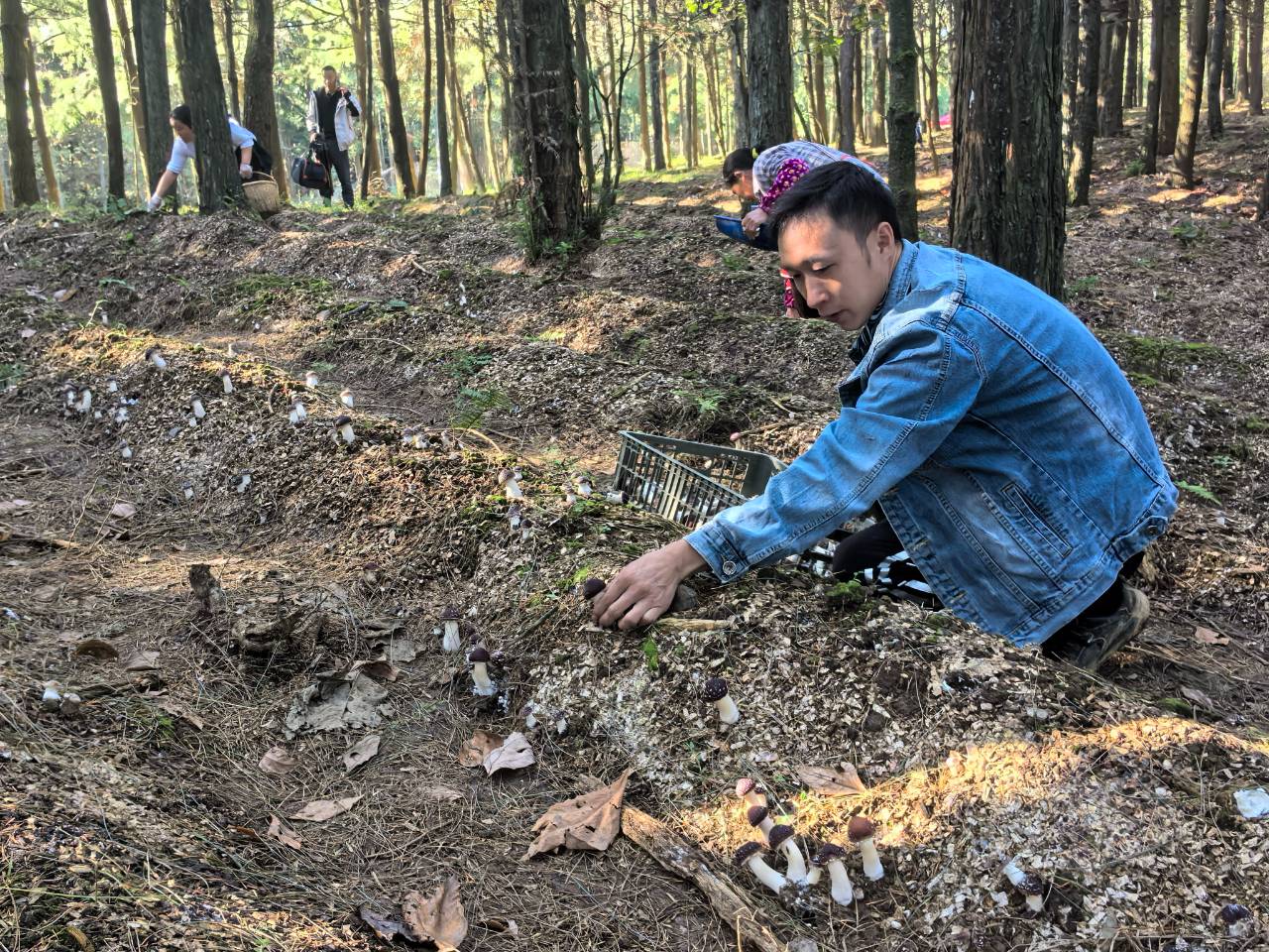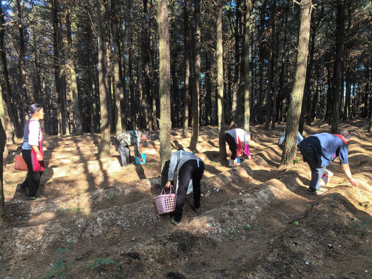 在种植基地,10多名工人提着小篮子,沿着种植的松茸垄,认真而细心地采摘长出的赤松茸菌菇。这些能采的赤松茸大的有十多岁小孩的手腕般粗,小的如成人的手指般粗,十分喜人。采摘赤松茸的工人都是当地就近的群众。