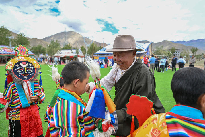 2025年7月16日,76岁的湘巴藏戏国家级非遗代表性传承人次仁多吉(右二)在西藏南木林县非遗公园内给即将表演湘巴藏戏的小演员整理服装。新华社记者李鑫摄