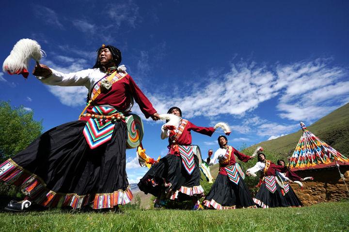 2020年7月1日,在西藏山南市琼结县,久河村卓舞队的队员在表演国家级非遗代表性项目“久河卓舞”。新华社记者詹彦摄