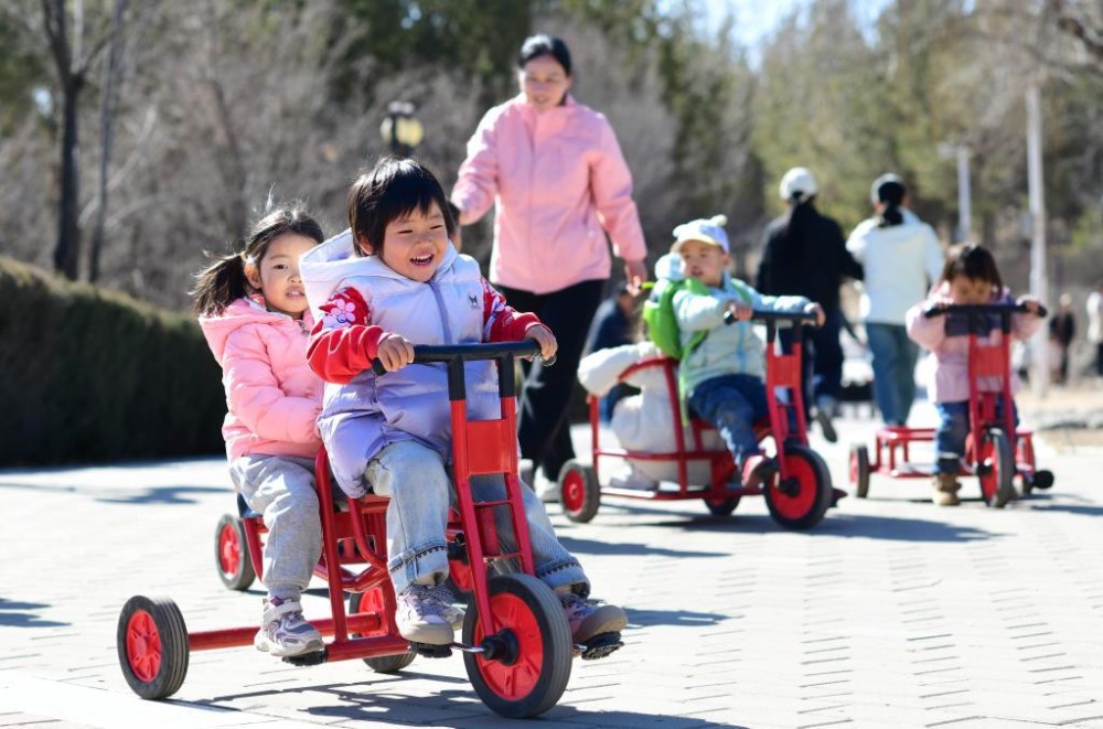 △2025年3月19日,在内蒙古鄂尔多斯康巴什区一所托育园,老师陪伴孩子做体能游戏。保障和改善民生是一项长期工作,没有终点站,只有连续不断的新起点。