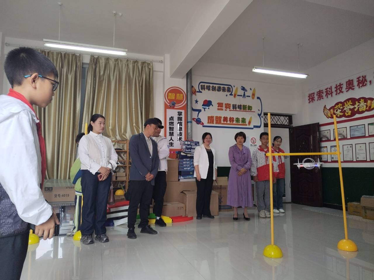 永善县民族小学科创小组学员(左一)为师生们展示无人机穿越障碍技能。