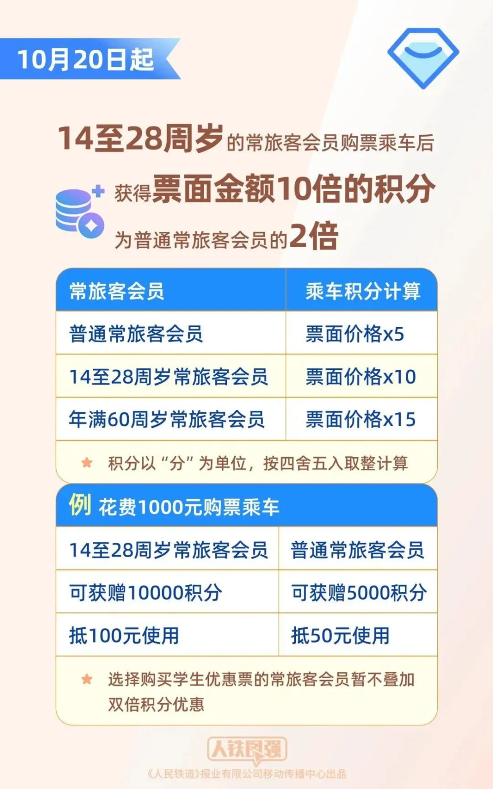 10月20日起,14至28周岁的常旅客会员购票乘车后将获得票面金额10倍的积分,为普通常旅客会员的两倍,即普通常旅客会员花费1000元购票乘车,可获赠5000积分、抵50元使用;