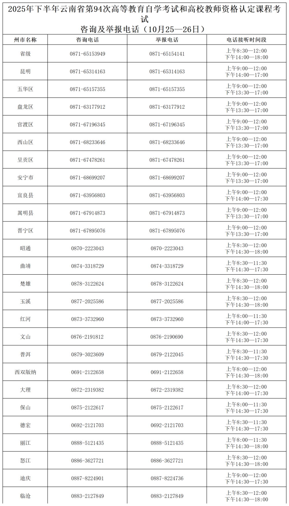 2025年下半年云南省第94次高等教育自学考试将于10月25—26日进行、高校教师资格认定课程考试将于10月25日进行。请参加考试的各位考生坚守“诚信守法光荣、违规舞弊可耻”的理念,严格遵守考试纪律、知法、守法,诚信考试、拒绝作弊。为确保考试平稳顺利进行,现将考试有关事项提醒如下: