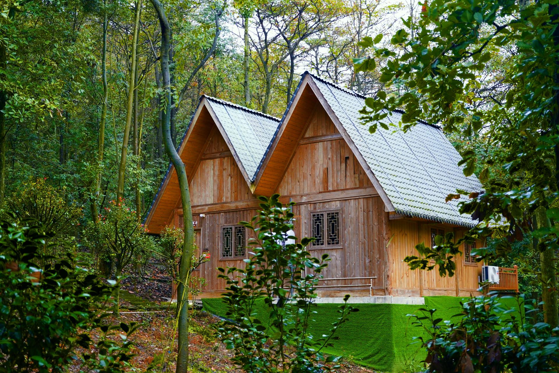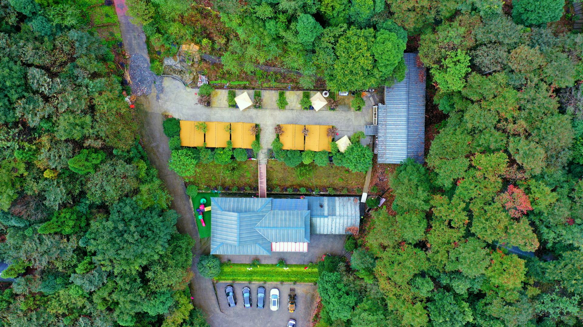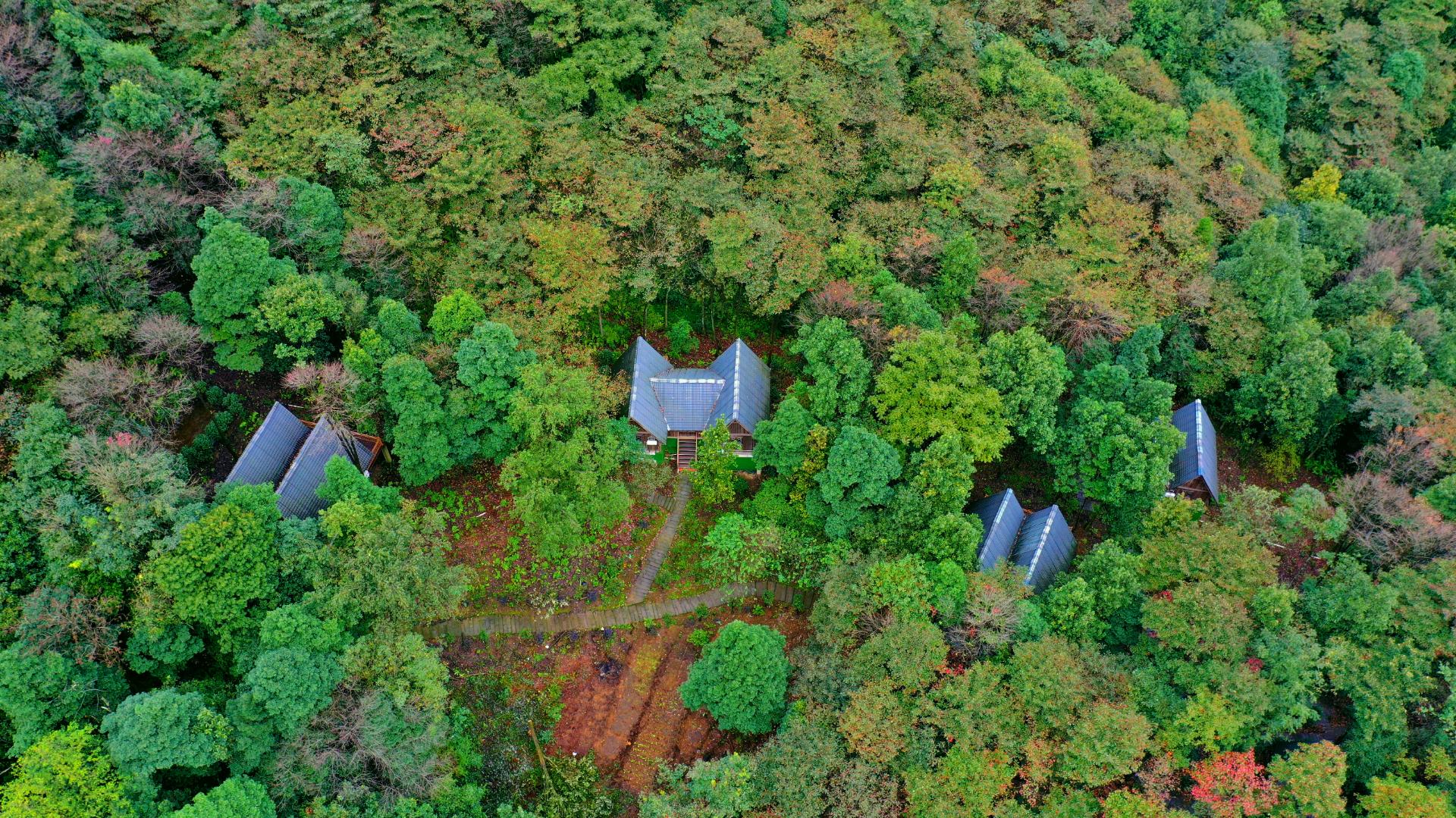 金秋十月,俯瞰会仪镇峰顶山,万木葱茏、层林尽染,几座小木屋星星点点地洒落在林海深处,深灰的屋顶与斑斓的森林相映成趣。游客三三两两来到森林,在池塘边惬意垂钓,在林荫道上悠闲漫步,在丛林里肆意高歌,在小木屋尽享宁静……