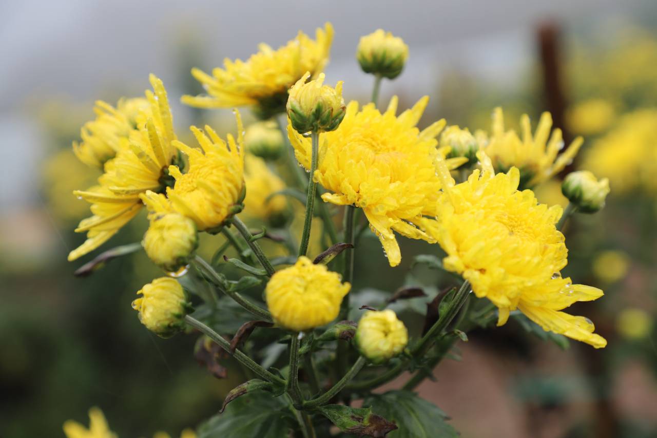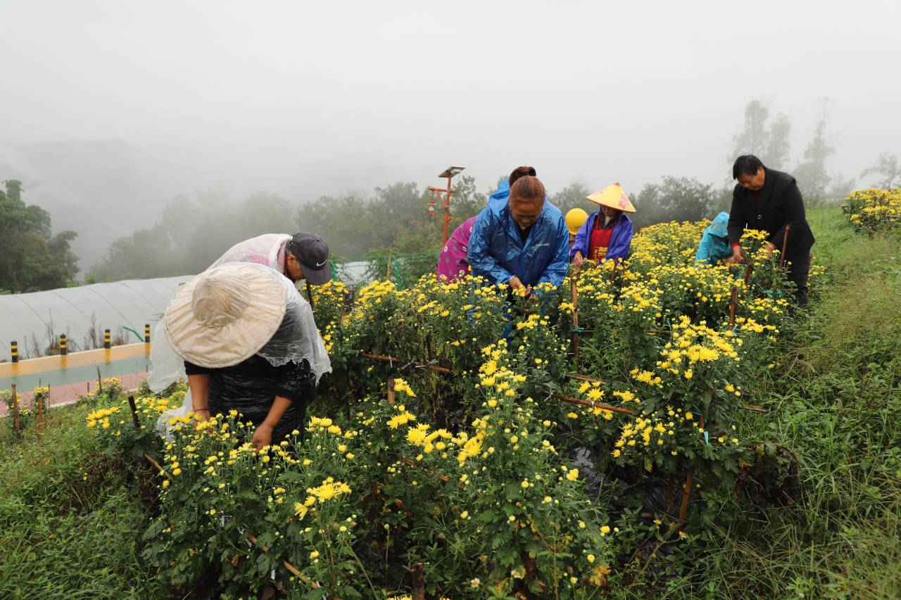 10月20日,细雨蒙蒙,在金丝黄菊花海里,村民黄吉芬正带领10余位工人忙着为菊花疏花,指尖轻捻间剔除多余花苞,确保养分集中供给。她抹了抹额头上的雨珠,脸上洋溢着丰收的喜悦说:“现在我每月工资能有5000多元,平时每天需要20多人管护,等进入盛采期,每天需要40多人采摘黄菊。”