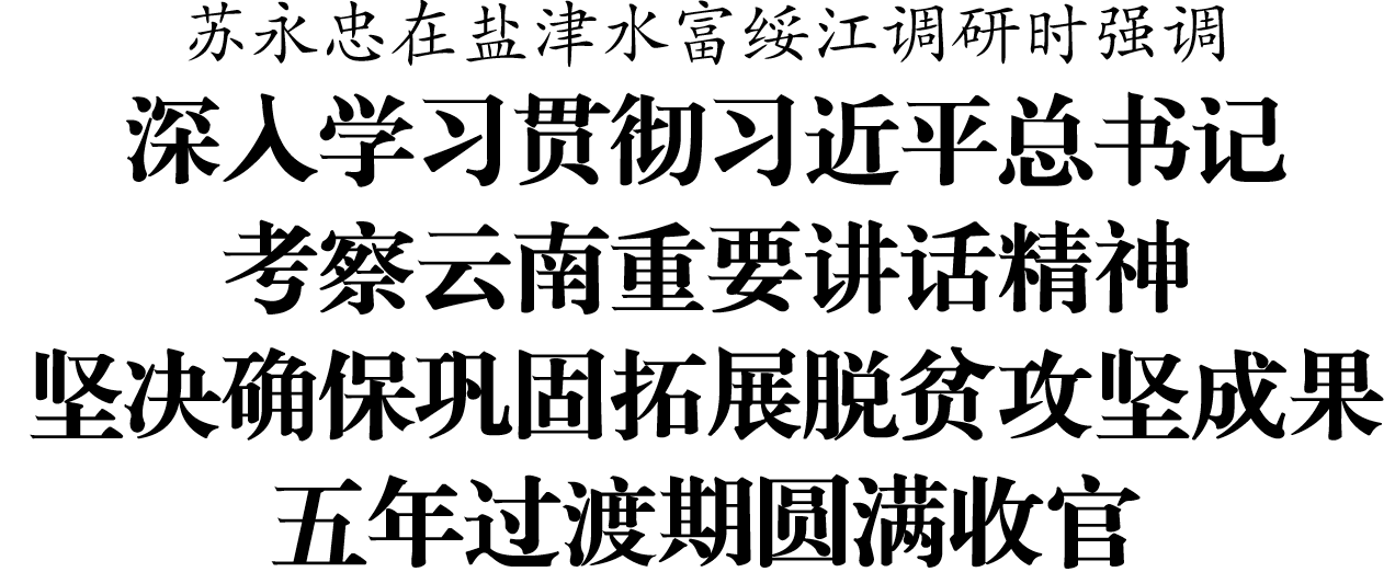10月23日至24日,市委书记苏永忠到盐津县、水富市、绥江县调研时强调,要深入学习贯彻习近平总书记考察云南重要讲话精神,认真落实中央、省部署要求,扛牢责任、真抓实干,长久守牢不发生规模性返贫致贫底线,用实际行动答好“群众持续增收之问”,坚决确保巩固拓展脱贫攻坚成果五年过渡期圆满收官。