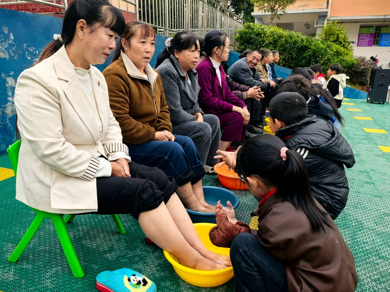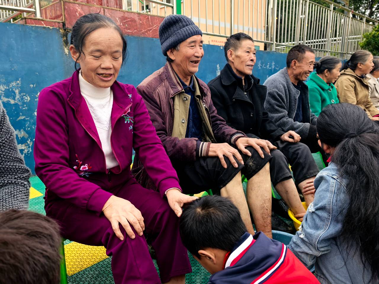 水雾氤氲中,一双双小手轻轻搓洗着布满老茧的脚,也揉开了岁月沉积的辛劳。这些常年弯腰劳作的双脚,今天被捧在手心里呵护。