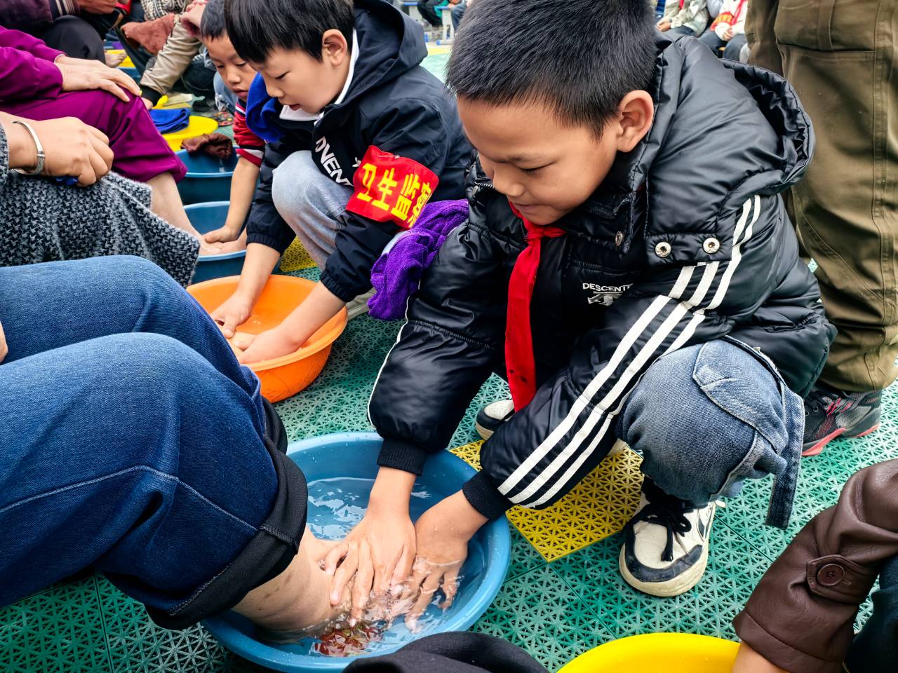 这样的场景在现场不断上演。11岁的男孩小浩熟练地为爷爷按摩肩膀,“爷爷腰不好,我天天给他捶背。”他的手法虽然稚嫩,却格外认真。爷爷笑得合不拢嘴:“娃娃长大了,懂事了。”看着为自己洗脚的孙子孙女,老人们脸上满是欣慰,虽然没有太多语言表达,但藏不住脸上的笑容,嘴里不断重复说着:“要好好学习,听老师的话。”