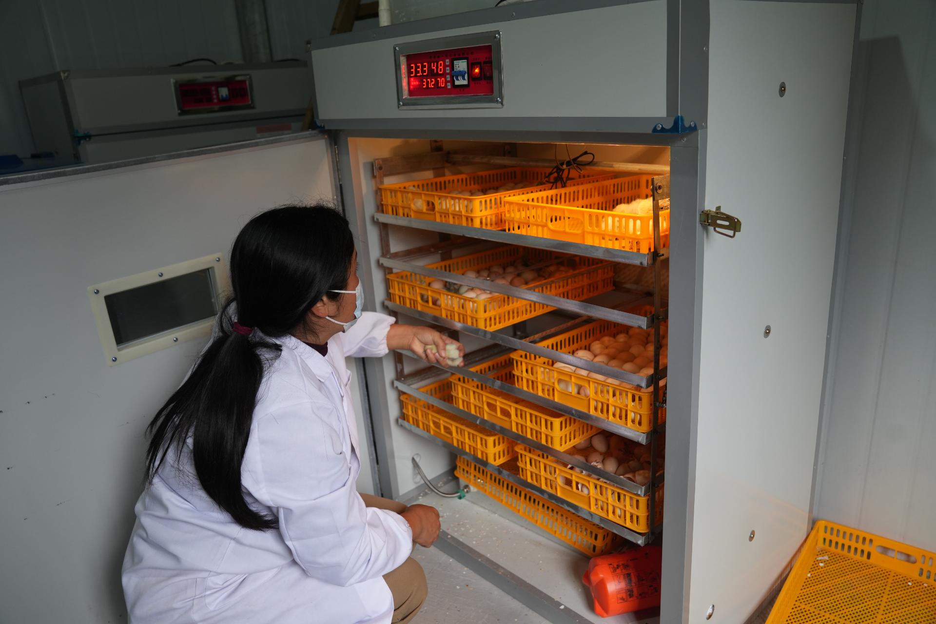 庙坪村山林资源丰富,森林覆盖率高,气候温润。自2018年起,村里便瞄准了林下养殖白羽乌鸡这条生态致富路,通过免费发放鸡苗、提供无息贷款等政策,逐步引导农户参与。然而,外购鸡苗成本高、运输损耗大、疫病风险高等问题,一度制约着产业规模的扩大和质量的提升。智能孵化中心的建成,精准破解了这些难题。恒温恒湿的智能设备替代了传统母鸡抱窝,每批鸡苗在科学的环境中孵化后转入脱温室,技术员全程把控种源质量与孵化流程,鸡苗成活率与健康水平显著提高。“我们自己孵化成本低,质量有保障,养殖户更有信心!”杨琴说道。