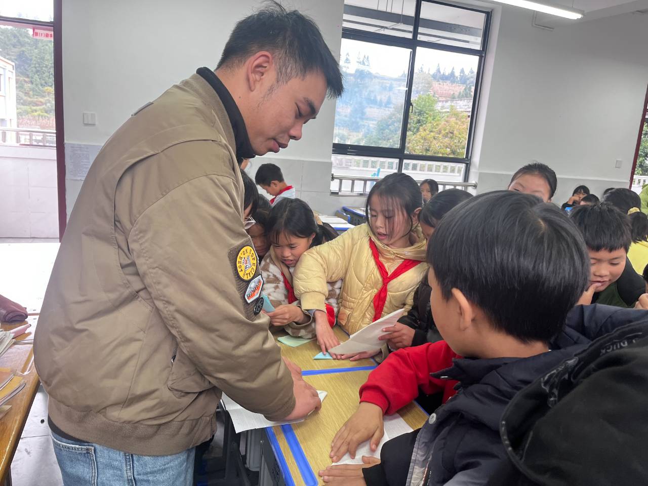 课下他是孩子们的“大哥哥”——教他们折能飞得远的纸飞机,还跟他们比赛谁的飞机飞得远;看到学生在操场玩沙包缺人,他就会加入他们当“队友”;有学生感冒了,他会把自己的保温杯借给孩子喝热水并叮嘱她:“要多喝热水,鼻子就不塞了。”