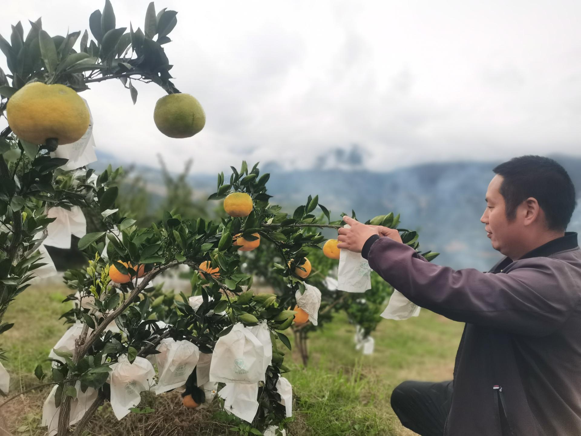 图为永善县华垦农林技术开发有限责任公司管理人员肖奇健在为早熟蜜橘套袋。