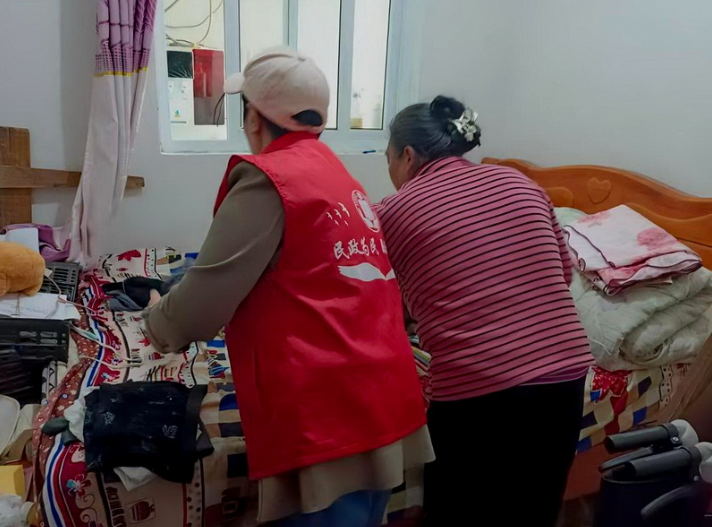 当清晨的第一缕阳光洒向大地,彝良县发界安置区前进社区的干部王帮琴便带着志愿者来到独居老人杨兴丛家门前,轻轻敲响了房门。这一天,她们计划为杨兴丛清洗衣物、擦拭身体、打扫房间。