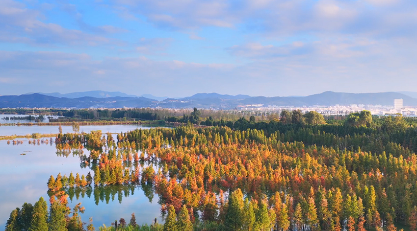 滇池南岸层林尽染的水杉湿地里,散步赏景的游人随手拍下秋日大片;文山丘北如诗如画的芦苇湖畔,当地人伴着芦花轻吟家乡小调;从纳帕海翩跹而至的黑颈鹤,到南涧鹭牛同框的生态画卷;从彩林相映、层林尽染,到石林仙女湖的原始野趣……