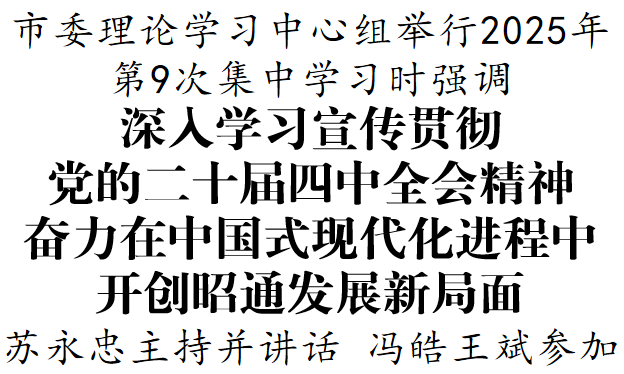 11月4日,市委理论学习中心组举行2025年第9次集中学习,强调要深入学习贯彻党的二十届四中全会精神,紧紧围绕习近平总书记在党的二十届四中全会上的重要讲话精神和全会审议通过的《中共中央关于制定国民经济和社会发展第十五个五年规划的建议》,统一思想、统一意志、统一行动,在全市迅速兴起学习宣传贯彻热潮,奋力在中国式现代化进程中开创昭通发展新局面。