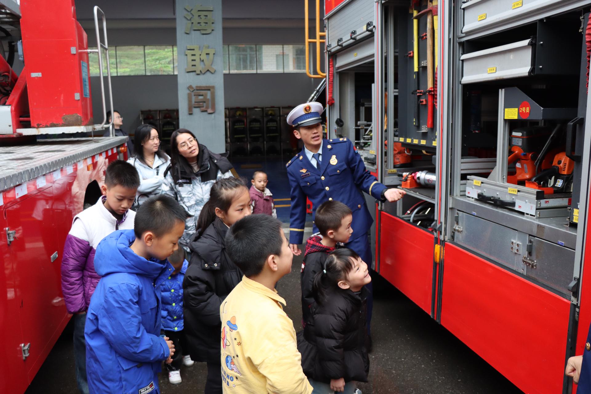 在消防车库,消防救援人员向亲子家庭展示了各类消防车辆及装备,详细讲解了不同消防车的功能特点及随车器材在灭火救援中的用途。