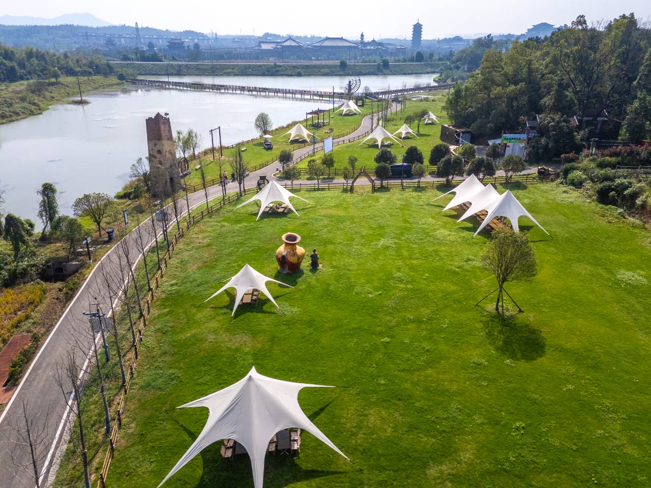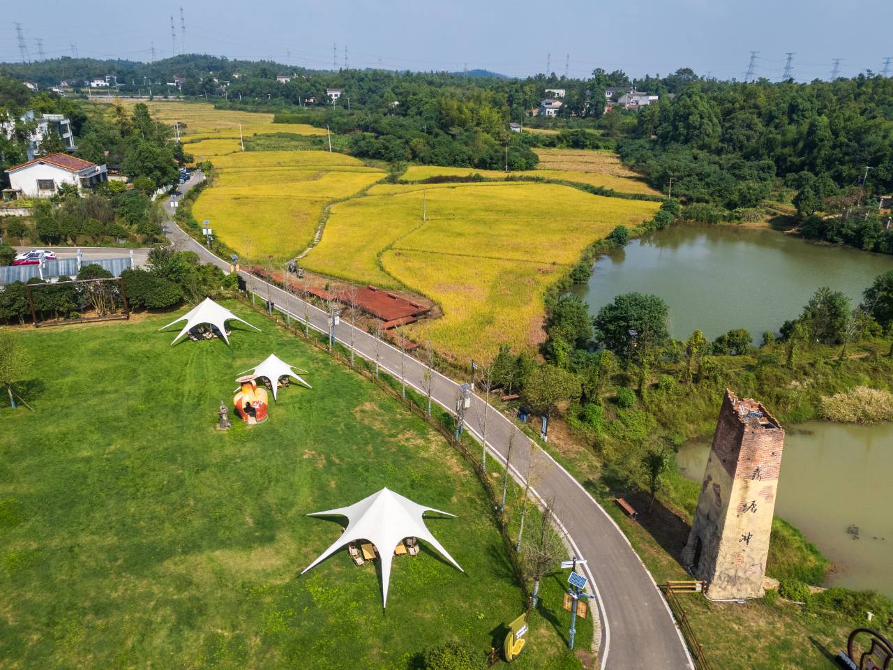 位于彩陶源村的生态营地与金色稻田相映成趣。
