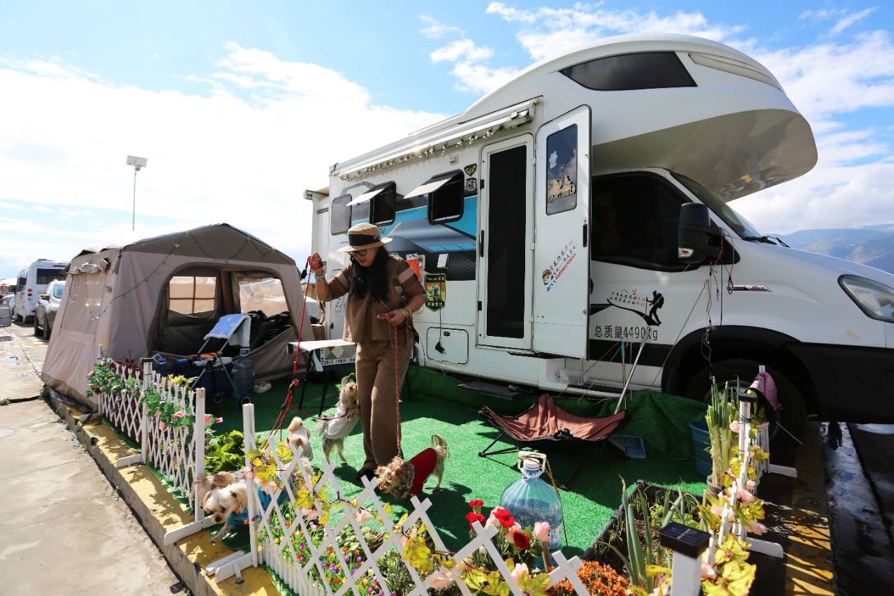 11月4日,在巧家县栗喉蜂虎房车营地,一名旅居游客在遛狗。