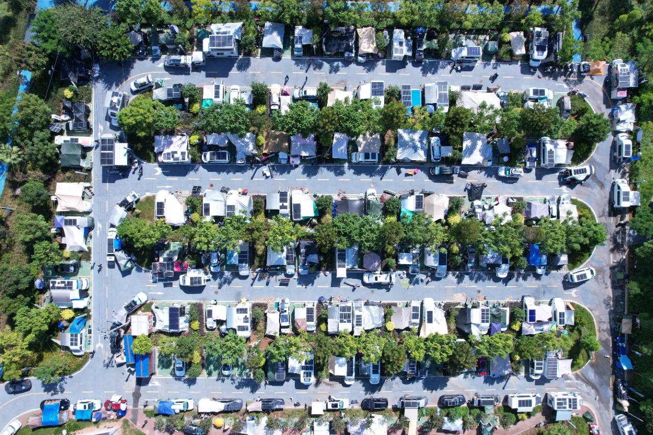 11月4日,巧家县栗喉蜂虎房车营地,停满了来自全国各地的房车(无人机照片)。