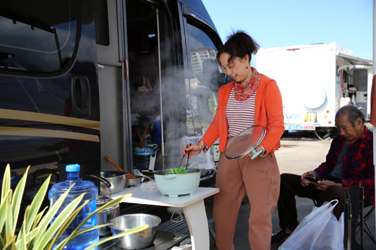 11月4日,在巧家县栗喉蜂虎房车营地,一名旅居游客在做菜。