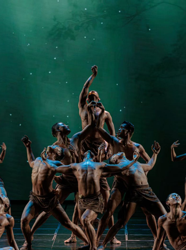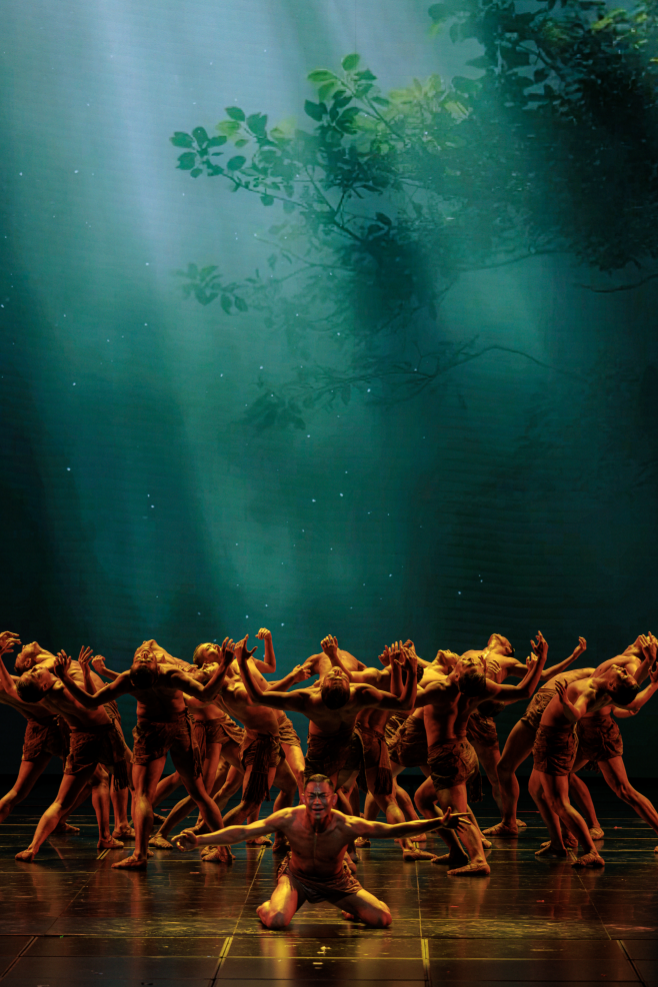 《太平有象》深度挖掘“河清海晏、民康物阜”的文化内涵,运用现代化编创理念与傣族舞“三道弯”等传统舞蹈语言,创新肢体表达,以“象”寓“象”,构建了人与自然和谐共生的美好图景。音乐、舞美等营造出热带雨林的沉浸氛围,既寄情于人与万物的共生之道,又彰显出家国大爱与天下太平的胸怀,在人类命运共同体的时代语境中传递出“美美与共”的生动意象。