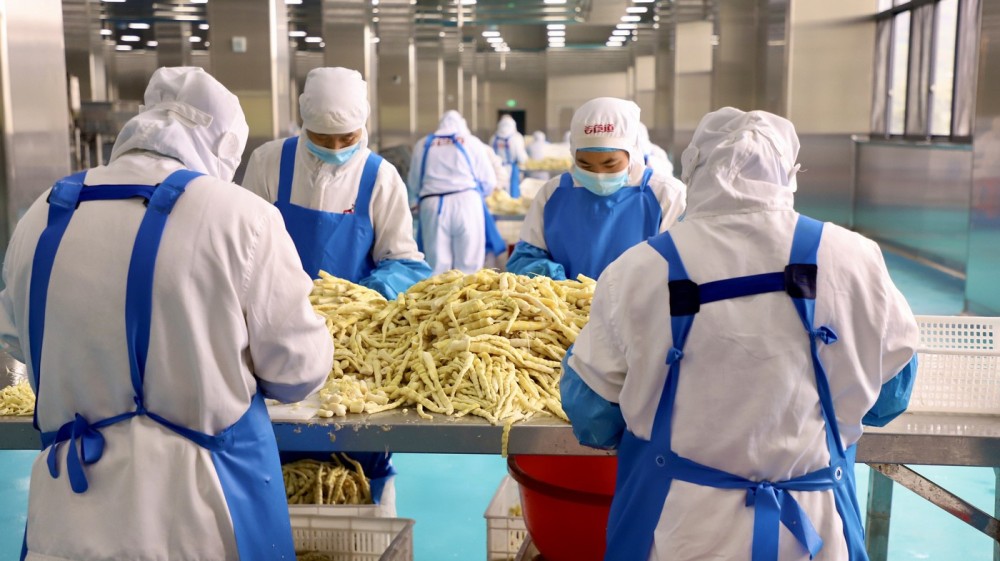 分拣台上,带着晨露的新鲜竹笋整齐排列,工人们熟练地挑拣分级、称重装袋,流水线末端的真空包装机匀速运转,X光机精准探测异物,杀菌车间的高温设备正进行最后的品质把控。这座于2024年6月启动建设,今年8月刚投产的现代化工厂,正将大山里的“土特产”转化为带动群众增收的“金竹笋”。